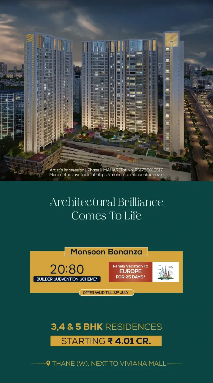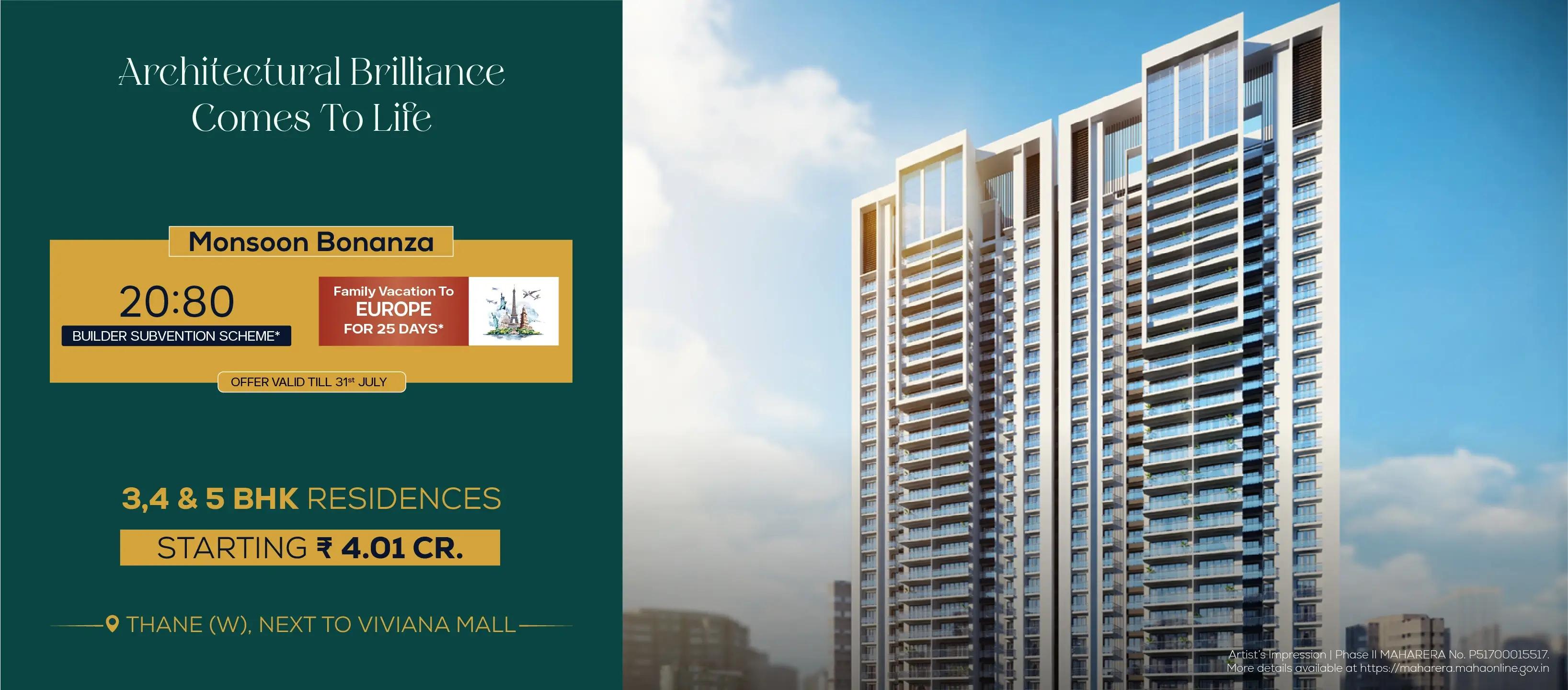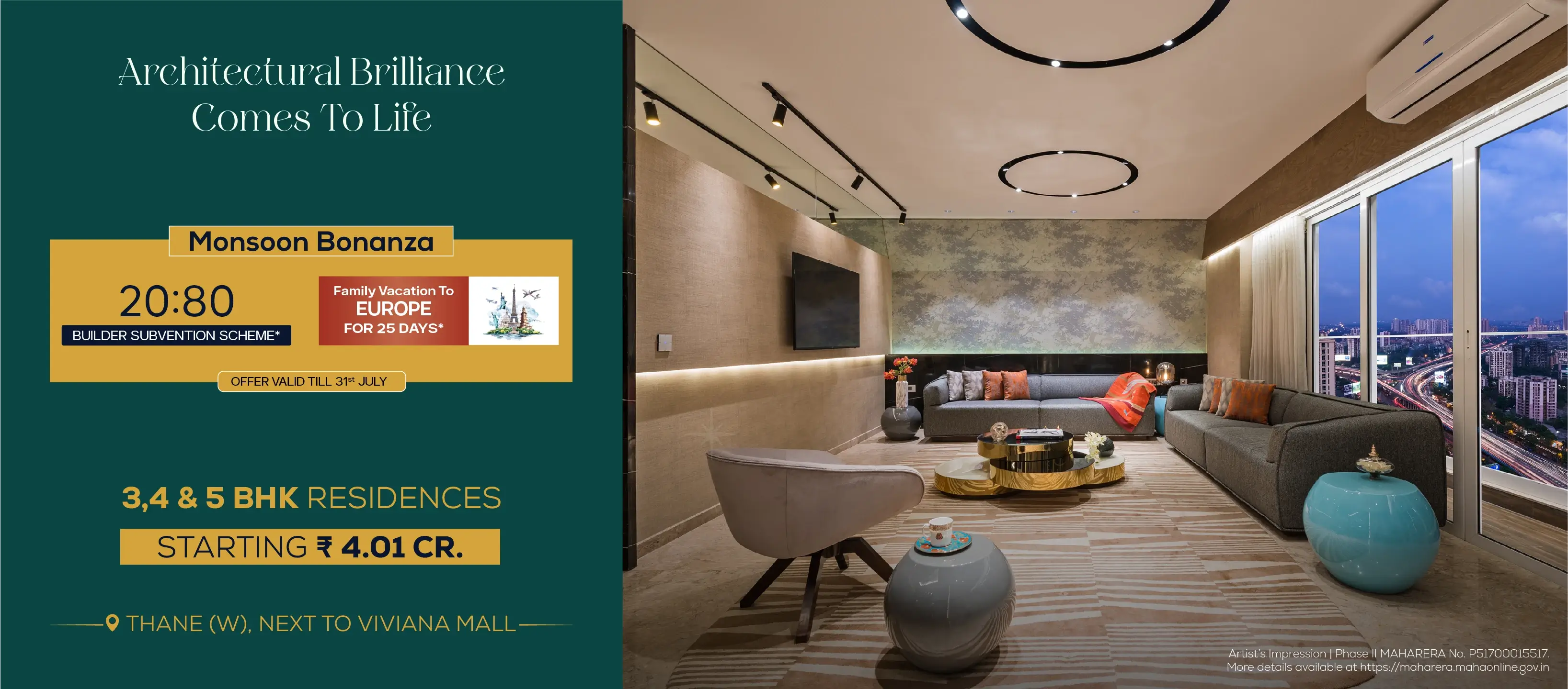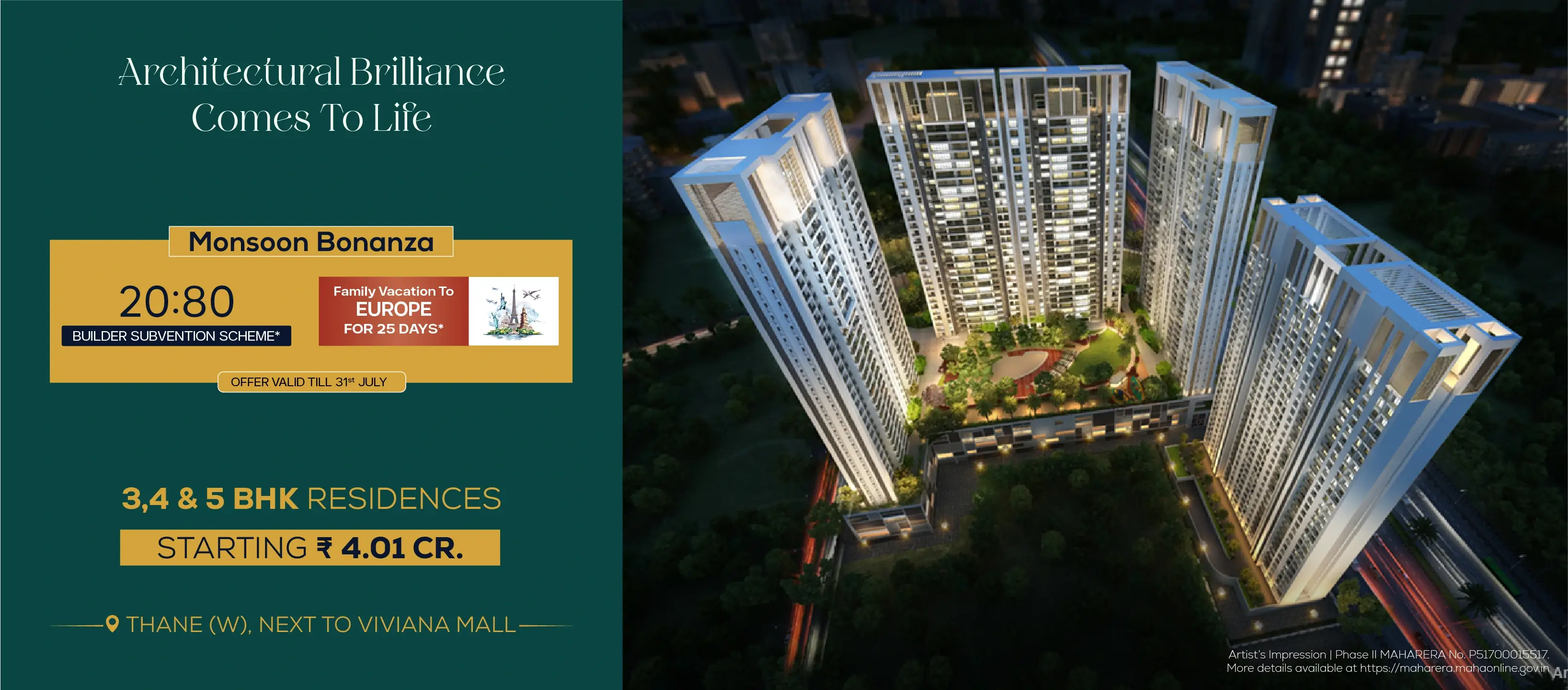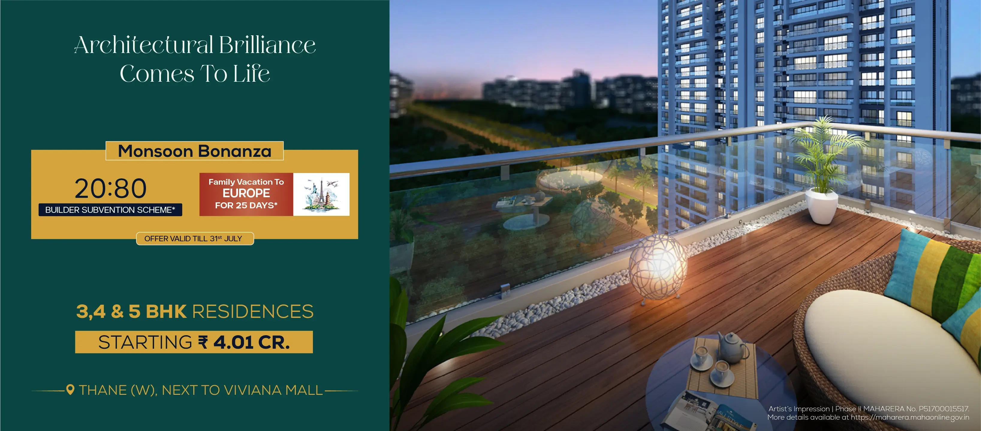 With only two apartments per floor, grand decks, and panoramic vistas of Parsik Hill, Yeoor Hills, and the cityscape, Avalon brings a regal living experience blended with modern convenience - just steps from Viviana Mall, Jupiter Hospital, and metro stations. With Phase I OC secured and Phase II under construction, Sheth Avalon raises the bar for ultra‑luxury living in Thane .