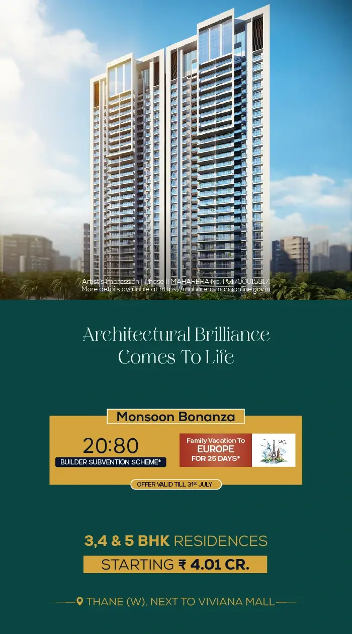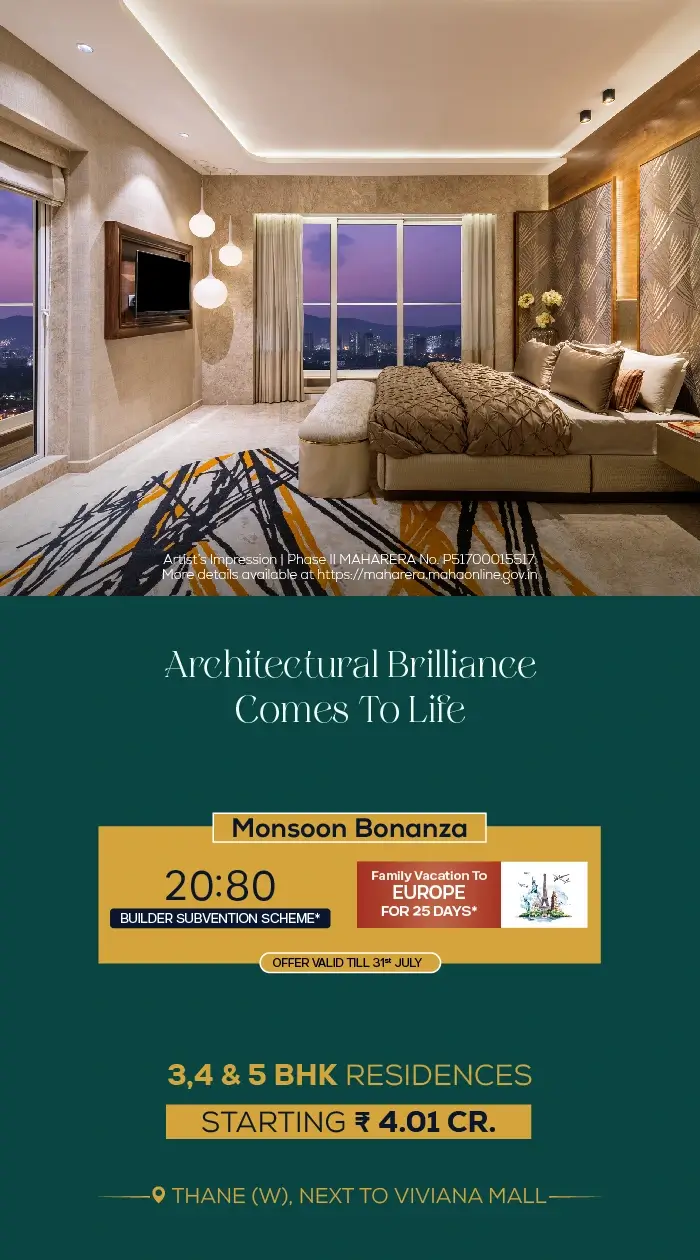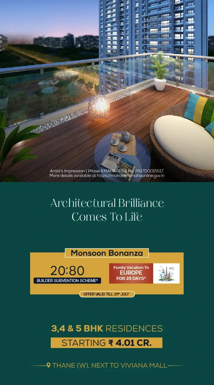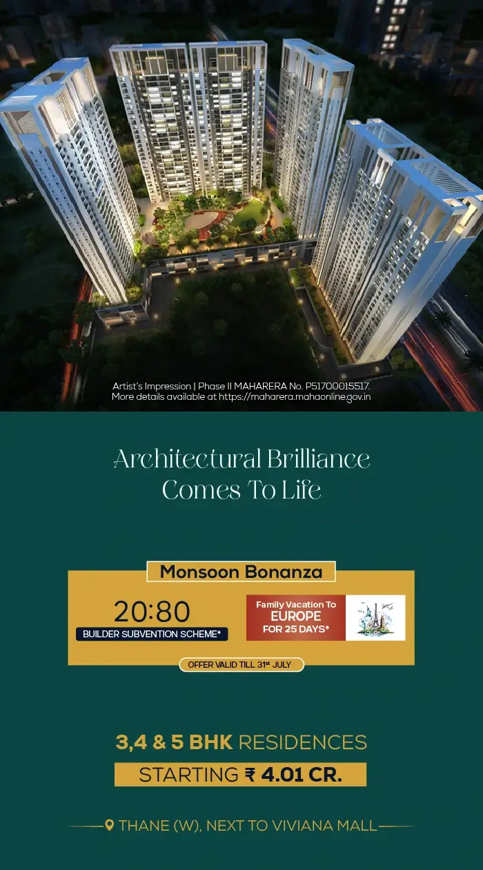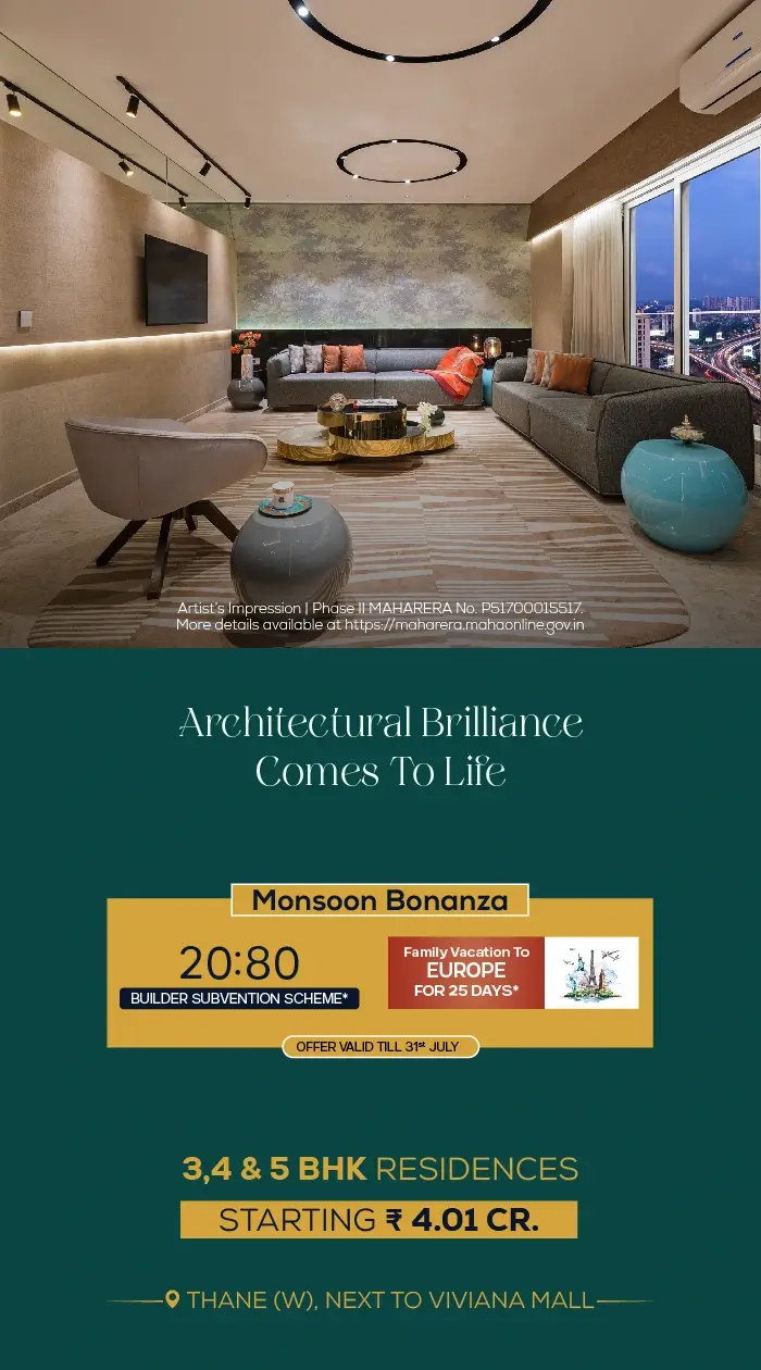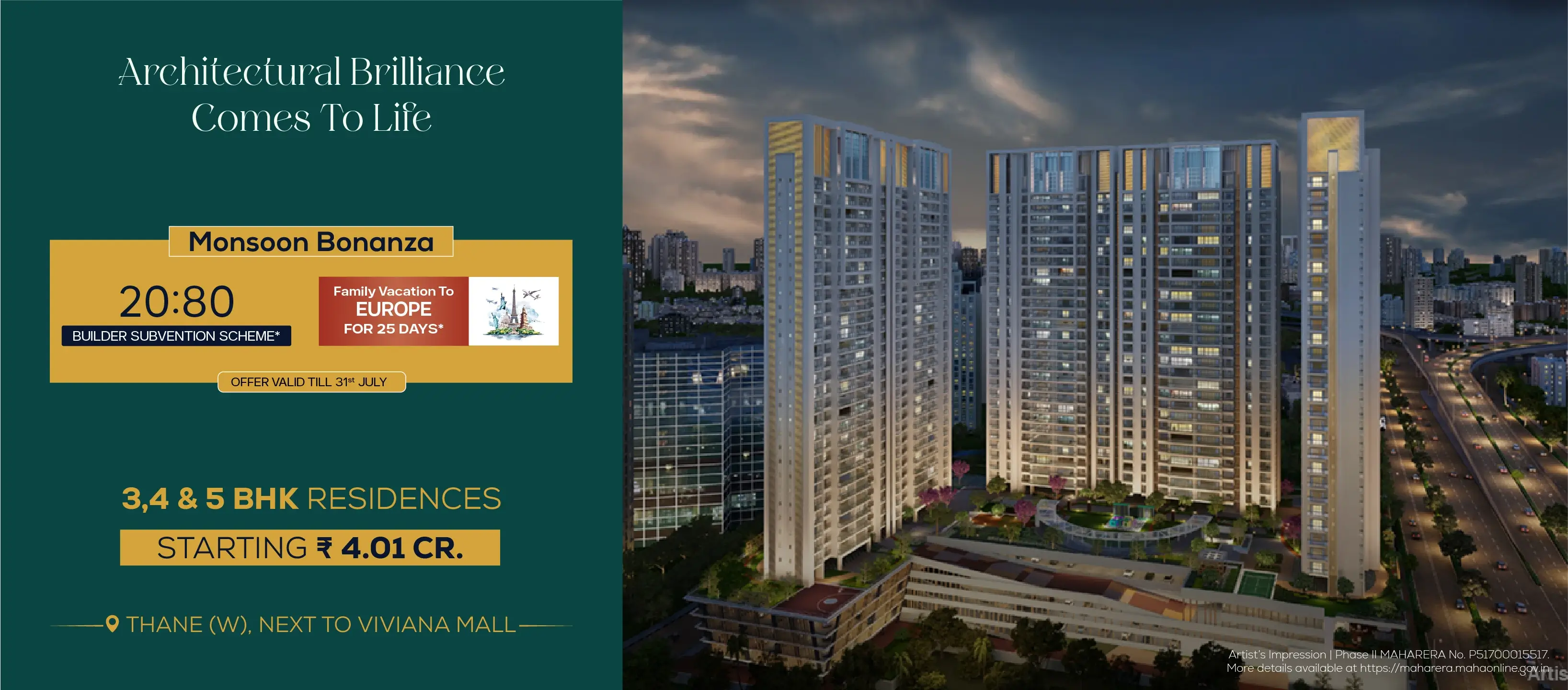 With only two apartments per floor, grand decks, and panoramic vistas of Parsik Hill, Yeoor Hills, and the cityscape, Avalon brings a regal living experience blended with modern convenience - just steps from Viviana Mall, Jupiter Hospital, and metro stations. With Phase I OC secured and Phase II under construction, Sheth Avalon raises the bar for ultra‑luxury living in Thane .